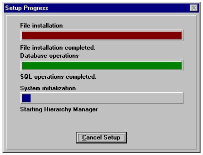 The Setup program copies files, completes the database installation, and starts the SMS services. A Setup Progress dialog (see fig. 24.12) displays the status of the installation, which usually takes about 10 to 15 minutes. When the SMS Setup process is complete, click OK in the Setup Success message box to have the Setup program create a Start menu SMS program group. It isn't necessary to restart the server after installing SMS.