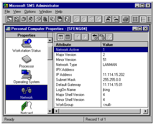 Double-clicking a client item in the right pane displays the Personal Computer Properties MDI child window for the client (see fig. 24.17). You select the properties to view or actions to take in the Properties list. Most of the information in the Attribute and Value list is derived from performing SMS's PC inventory function, which the SMSDemo database simulates. Table 24.2 lists the properties and actions available in the Personal Computer Properties window.