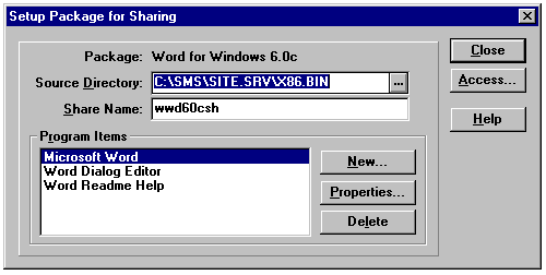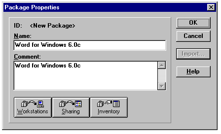 A Package Definition File (PDF) is a text file that contains predefined Workstations, Sharing, and Inventory property settings for a package. To create a new package, you can use the Import command from the Package Properties dialog and use one of SMS's predefined PDFs to specify the properties for that package. SMS includes PDFs for some of the more popular applications, such as Microsoft Excel and Microsoft Word; other software publishers also create PDFs. Figure 24.18 shows the creation of a new package for installation of Word 6.0c. Clicking the Sharing button lets you specify the location of the package and the share name (see fig. 24.19).