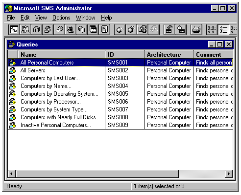 System Management Server's Queries window lets you run quick queries to inventory clients meeting specific criteria. The workstation information is collected by the inventory agent when SMS client software is installed. The inventory information is saved in a set of SQL Server tables. The Queries window executes SQL SELECT queries against these tables and automates the process of writing the SQL statements for these queries.