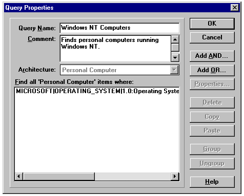 The preceding steps create and execute a simple query that has only one criterion. By using additional Add AND or the Add OR functions, however, you can add more operators to define more query details. For example, you can add an AND operator with the System Role of the machine and choose Server. Such a query detects only Windows NT servers.