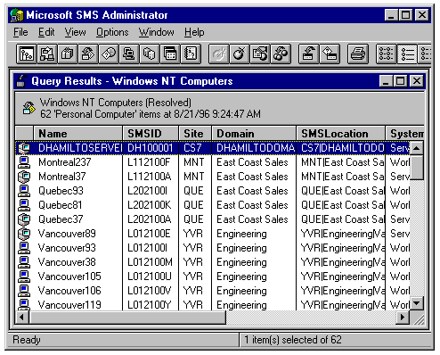 The query result set for the Windows NT Computers query using the SMSDemo database.