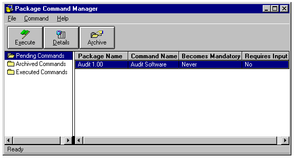 Figure 24.31 shows the client's Package Command Manager with a pending Audit Software package created from the Audit.pdf file included with SMS 1.1. When the user clicks the Execute button, the result of the audit is staged for transfer to the Primary Site.