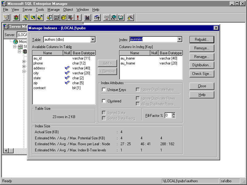 The authors table is selected in the Table combo box, and the aunmind index is selected in the Index combo box.