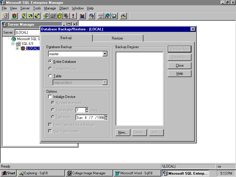 The main control panel for backup and restore operations enables you to select and create devices and set scheduling options.