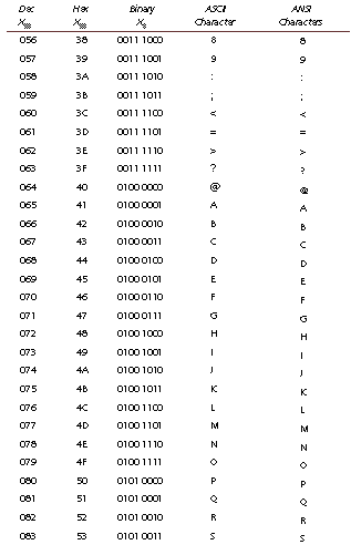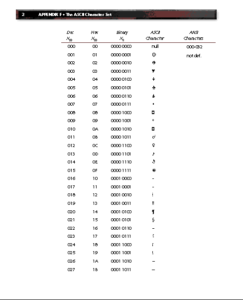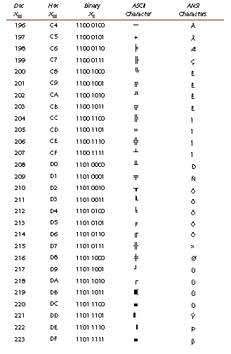 This appendix cross-references the characters represented by ASCII and ANSI code. To convert a code into a character, use Chr(code); to convert a character into a code, use Asc(char). ANSI codes lower than 20 should not be used in a Web