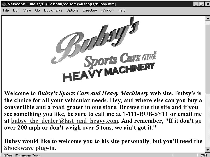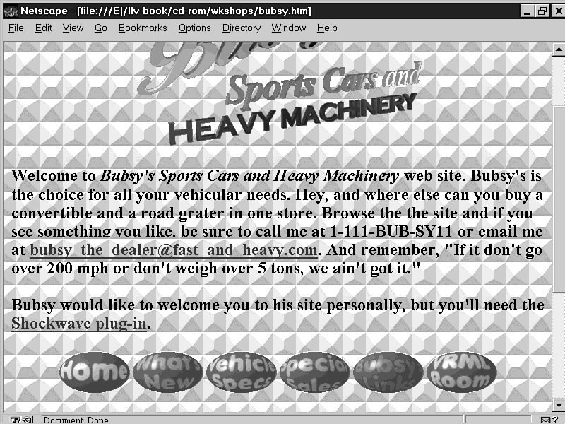 I was in Bubsy's showroom the other day examining his new line of convertible dump trucks when talk turned to the Web. Bubsy was anxious to establish a Web presence for his business and asked if I could help. I accepted the challenge, and the results of Bubsy's Sport Car and Heavy Machinery Web site follow.