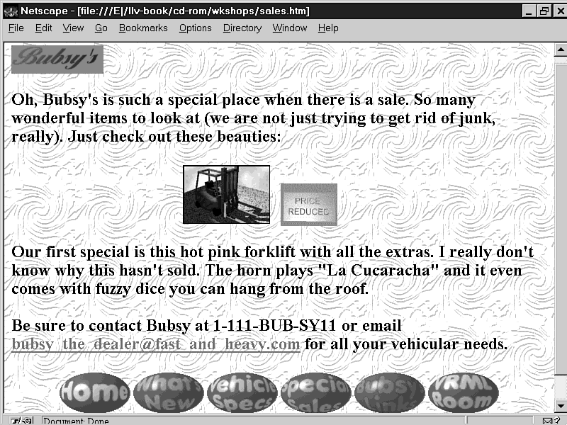 The core of the Web site is where you present your products. Bubsy wanted these split between three different pages: the What's New page, where the latest and greatest can be found, the Vehicle Specification pages, where the bulk of the items will go; and the Special Sales page, where discounted vehicles are highlighted.