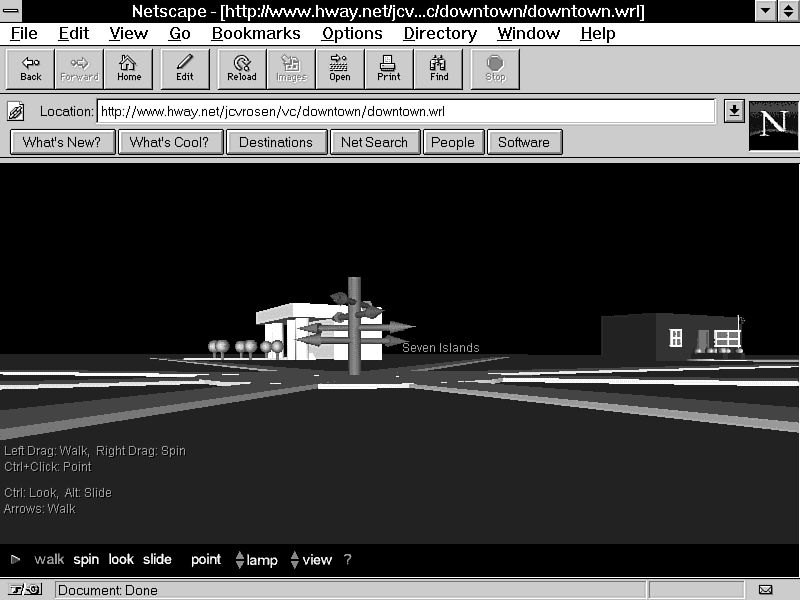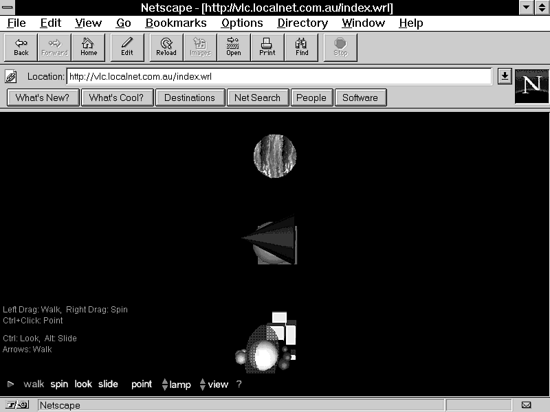 When you're first learning to get around, stick with just one navigation method. VRML browsers offer at least two different ways of exploring the world, and many offer more. Until you're familiar with one, it's wise not to chop and change. Changing is one of the quickest ways to get disoriented. There is quite a difference between being lost and being disoriented in VR worlds. Being lost means that you have absolutely no idea about where you are; being disoriented means you can't work out which way is up, or worse still, have no idea how to adjust your view so that you could work out where you are.