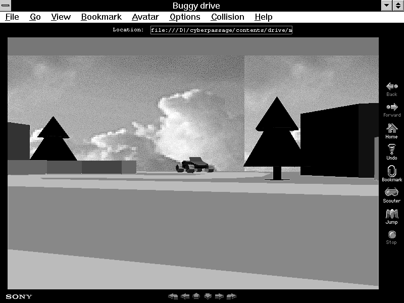 CyberPassage was the first VRML 2.0 browser to be available. (Yes, Sony does produce things other than TVs and stereo systems.) In the second version, it now supports VRML 2.0 and retains the same svelte interface of the first version. CyberPassage operates only as a standalone product, which is a bit of a pity, but its very fast rendering puts it ahead of CosmoPlayer on most aspects. (See Figure 13.10.)