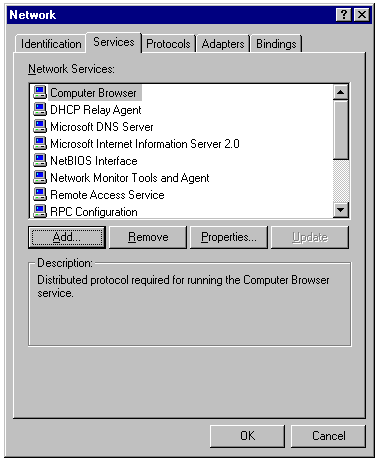 Adding or removing network services in the Services page of the Network property sheet.
