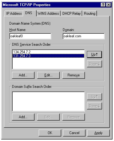 The DNS page of the Microsoft TCP/IP Properties sheet.