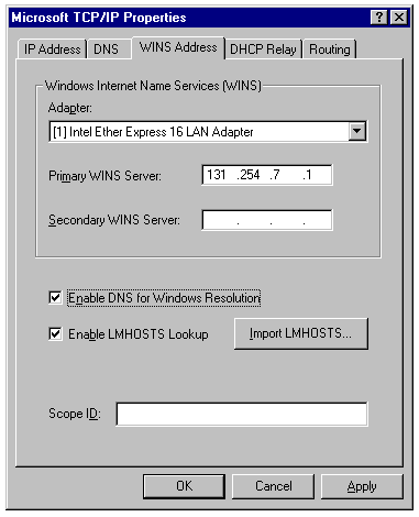 The WINS Address page describes the way that WINS (Windows Internet Naming Service) looks up the domain names of other computers (see fig. 6.9). Enter the IP addresses of your primary and secondary WINS servers as provided by the person who told you your own IP address. For machines that are local to your network, you may want to use DNS and LMHOSTS services; if so, select their check boxes. The Scope ID is usually left blank; provide a Scope ID only if you're told to by your network administrator.