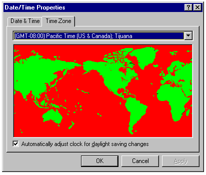 You now get a chance to set the time, date, and time zone. On the Time Zone page, select your time zone from the drop-down list. This list is arranged numerically according to the time difference from Universal Time (UT, formerly known as Greenwich Mean Time, GMT). Zones east of Greenwich, England, appear above it in the list. After you choose your time zone, the map of the world in this dialog scrolls so that your time zone is in the center. Windows NT Server knows the rules for use of Daylight Savings Time; make sure that the Automatically Adjust for Daylight Savings Time box is marked or cleared, as appropriate for your location.