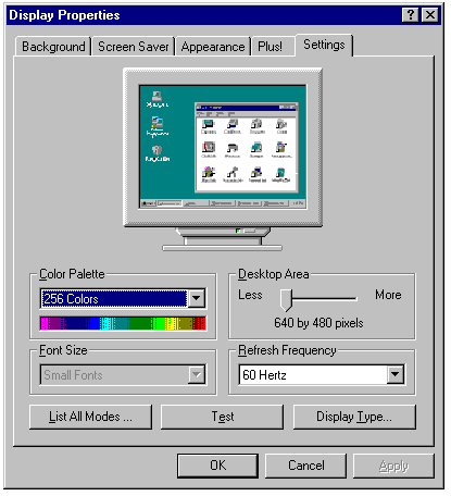 The Settings page of the Display Properties sheet (see fig. 6.11) lets you set a resolution and color depth suited to the combination of your graphics adapter card and video display unit (VDU). Some adapter cards provide additional features and controls on the Settings page. For a simple adapter, follow these steps to set your display properties: