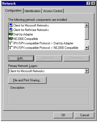 The Primary Network Logon determines which client software handles startup functions, such as user authentication and running logon scripts. By default, Windows 95 sets the Client for Microsoft Networks as the Primary Network Logon. You can set one of the other installed network clients as your Primary Network Logon if you prefer your startup functions to be performed by that client. You also can select Windows Logon as your Primary Network Logon, if you prefer not to connect automatically to the network each time you start Windows 95.