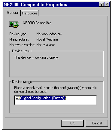 The network adapter resources page for an NE2000-compatible NIC.