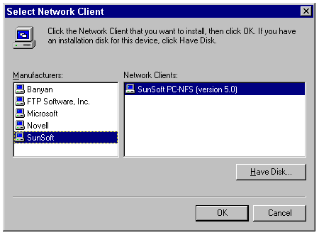 In addition to the Client for Microsoft Networks and the Client for NetWare Networks, Windows 95 provides client drivers for Banyan VINES, FTP Software NFS Client (InterDrive 95), Novell 16-bit ODI NetWare, and SunSoft PC-NFS. Additional client driver packages and updates are also available on diskette from third parties. To install one of these additional network clients, follow these steps: