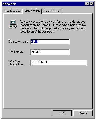 The Identification page of the Network property sheet, including the computer name and description, and the workgroup to which it belongs.
