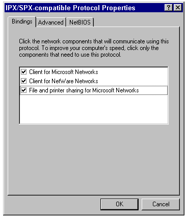 The Bindings page of the IPX/SPX-Compatible Protocol Properties sheet.