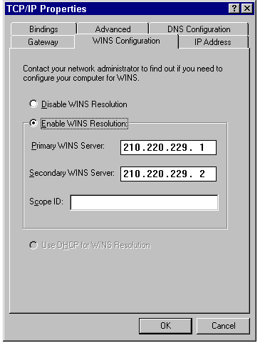 The WINS Configuration page of the TCP/IP Properties sheet.