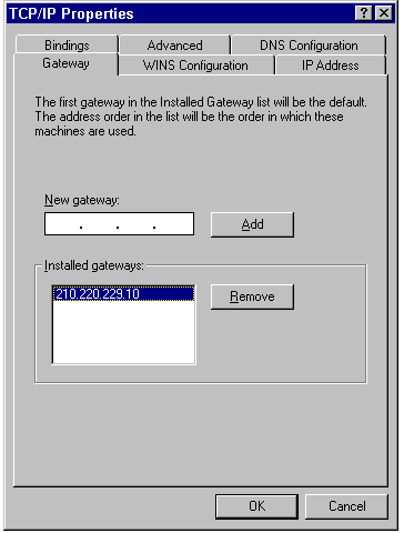 The first gateway appearing in the Installed Gateways list is the default, which is used when available. If the default gateway is unavailable, Windows 95 attempts to access other installed gateways in the order in which they appear in the Installed Gateways list.