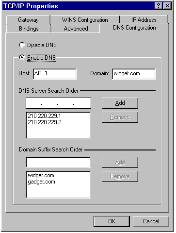 The DNS Configuration page of the TCP/IP Properties sheet (see fig. 10.26) lets you enable or disable the use of Domain Name Service (DNS) to resolve IP addresses and, if DNS is enabled, to provide DNS configuration information to the client. DNS translates character-based addresses, such as server names, to numeric IP addresses.