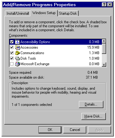 The Windows Setup page of the Add/Remove Programs Properties sheet.