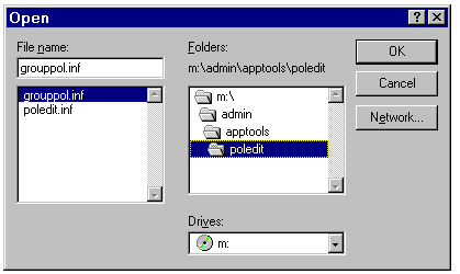 The Open dialog for installing Poledit.exe from a network drive.