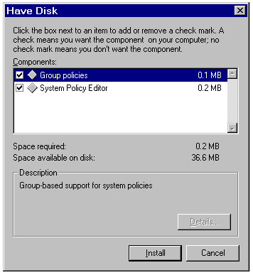 Click OK to display the Have Disk dialog (see fig. 10.41) and to choose the Components to be installed. Select Group Policies to install group-based support for system policies. Select System Policy Editor to allow setting system policies for your network. Click Install to begin installing the software. When the Add/Remove Programs Properties sheet reappears, click OK to complete the installation. You're prompted to restart your computer for the changes to take effect.