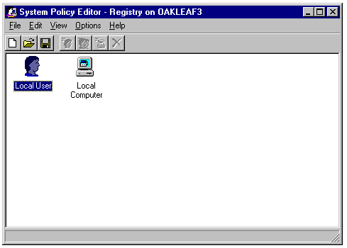 Policy Editor displaying the Local User and Local Computer icons for a remote Windows 95 computer (OAKLEAF3).