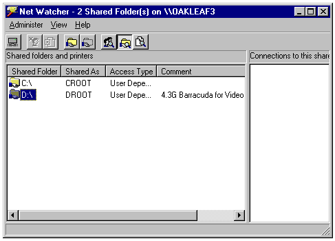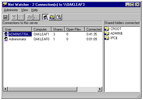 Using Net Watcher to display the users sharing folders of a remote Windows 95 computer (OAKLEAF3).