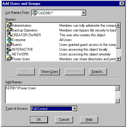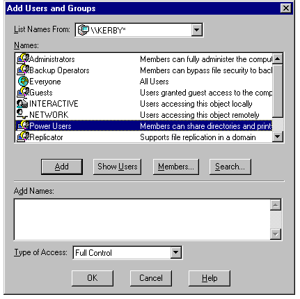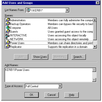 highlighting the name and clicking the Add button. Each user or group name