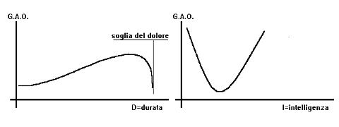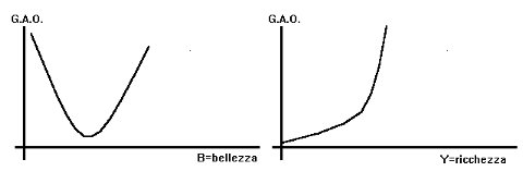La seconda fase ha visto all'opera un consesso di ricercatrici (la Ciani, la ex-Babbiona,...) le quali hanno a loro volta costruito un indice detto GAO, cioè Grado Apprezzamento Omini: anche in questo caso si è giunti ad una funzione f(B,Y,D,I) che presenta le variabili indipendenti bellezza (B), ricchezza (Y), durata (D) e intelligenza (I). Come avrete certamente notato in questo caso vi sono più variabili in gioco, ma ciò non ha impedito alle nostre esperte di costruire i grafici sotto riportati (Fig. 2).